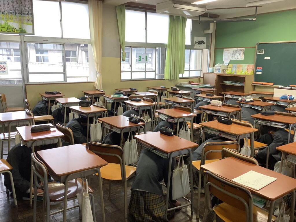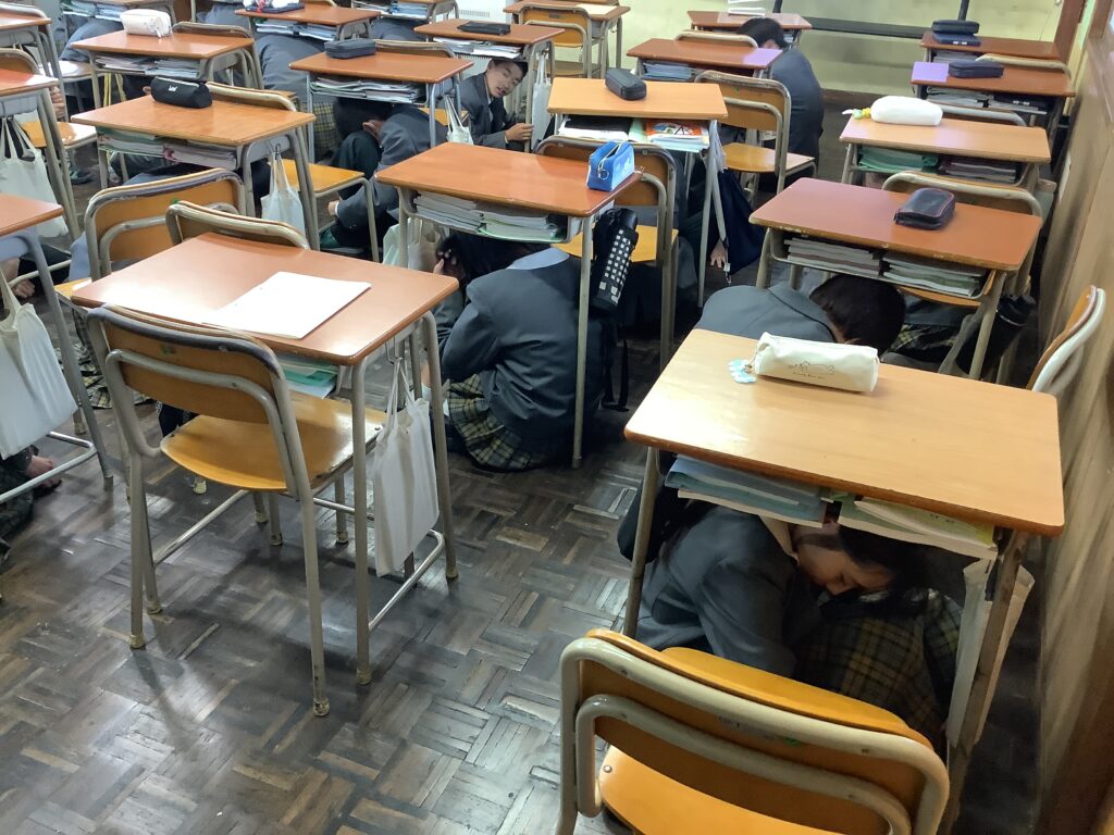 10年前の2016年4月14日に、熊本地方を震源とする地震が発生し、震度7を記録しました。大分県内でも大きな被害があった地震でした。この時期に、本校では防災学習訓練として地震、津波を想定した避難訓練を行っています。津波に備えての避難場所は白鳥神社ですが、雨天のため、校舎内での垂直避難を実施しました。北校舎、南校舎の4階に避難をするルートになります。災害はいつ起こるかわかりません。訓練は、災害が起こった時に安全に迅速にそして冷静に行動することができるための準備になります。定期的に訓練は行いますが、生徒の皆さんには、意識を高く持って臨んでほしいと願うばかりです。