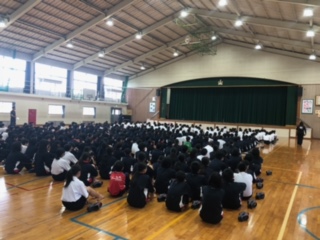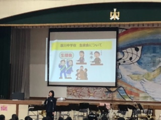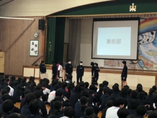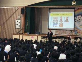 本日、入学した1年生にもっと学校のことを知ってもらおうと、学校の紹介、各部活動生による部活動紹介、午後からは生徒会が企画し、〇×クイズや長縄をして全校生徒が交流をしました。ちなみに1,2時間目は身体計測を行いましたが、静かに順番を待つ姿が見られました。部活動紹介は各部とも工夫した紹介になり、とても盛り上がりました。長縄では、各クラスが協力して取り組むことができました。1年生の皆さん、中学校のこと、もっと理解できましたか。いよいよ部活動の見学も始まります。どの部活動に入るのか、希望者はしっかりと考えてほしいと思います。2,3年生の皆さん、お疲れさまでした。生徒会執行部の皆さん、本当にありがとうございました。