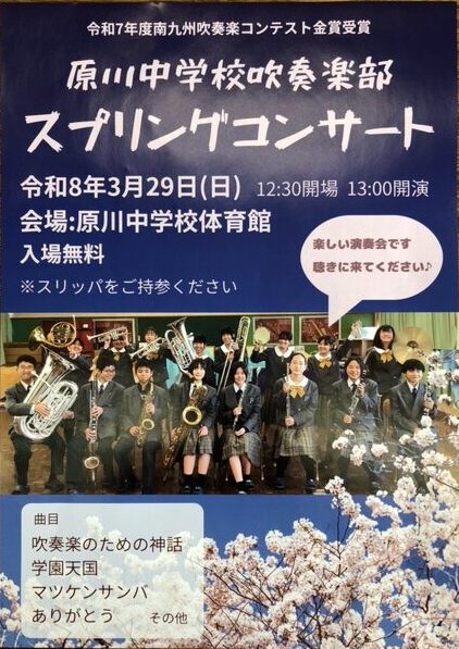 明日、3月29日(日)、原川中学校体育館で吹奏楽部スプリングコンサートが開催されます。本校の吹奏楽部は、人数は多くありませんが、令和7年度南九州吹奏楽コンテストで金賞を受賞し、地域のイベントでも演奏を披露しています。明日も多くの方々に聴いていただけたらと思います。入場は無料です。