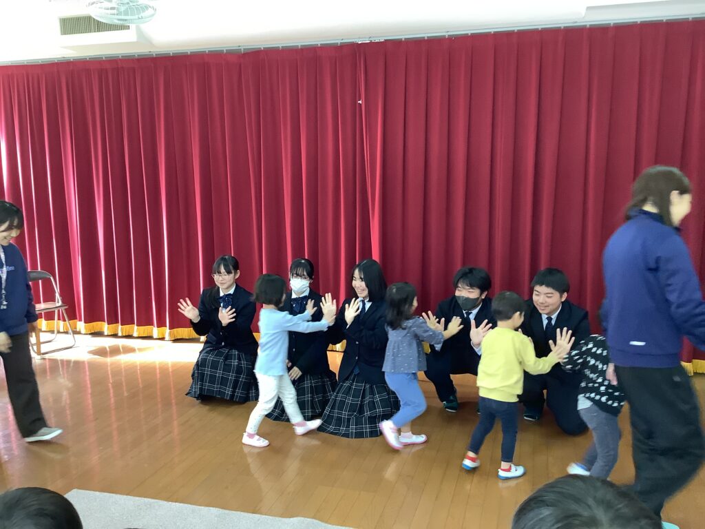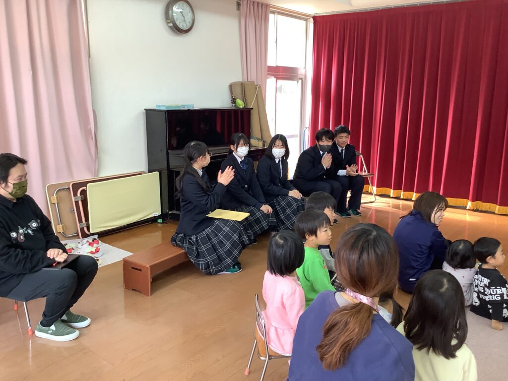 本日、3年生が『さがのせき認定こども園』で、絵本の読み聞かせ体験を行いました。家庭科の授業の一環として絵本を作成し、直接子どもと触れ合って読み聞かせをしました。最初は戸惑っていた生徒も時間を重ねるにつれ徐々に慣れていきました。生徒にとっては子どもへの理解を深め、園児と交流することで心温まる時間となりました。快く引き受けてくださった『さがのせき認定こども園』の皆さん、本当にありがとうございました。