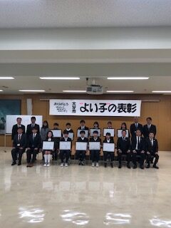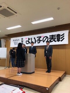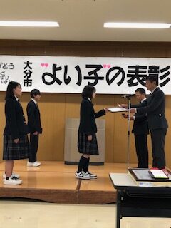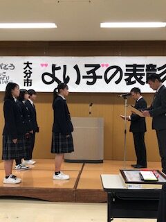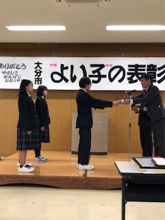 昨日、「よい子の表彰」の表彰式がありました。本校からは、1年生の齊藤悠音さん、2年生の後藤舞弓さん、姫野海琴さん、3年生の齊藤心音さんが出席しました。「よい子の表彰」は、他の模範となる善行や地域社会のために相当の期間、継続した善行を行った子どもを表彰し、子どもの社会的行動や道徳的な態度、実践力の向上など、子どもたちの豊かな心の育成を目的に大分市が行っています。今回4人は、怪我をして座り込んで動けなくなっている女性に声掛けし、1人が教員に状況を伝え救急車の要請をしました。4人は『大分市生徒指導研究会会長賞』を受賞し、最後に受賞者を代表して、齊藤心音さんがお礼の言葉を述べました。斎藤心音さんのお礼の言葉と4人の行動に対して、たくさんの先生方からお褒めの言葉をいただきました。