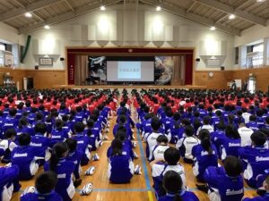5・6時間目に対面式が行われました。全校生徒が初めて体育館へ集合です。対面式第1部は、生徒会役員による1年生の生徒会入会式です。生徒会長より「学校生活をよりよくするために、全校生徒で頑張っていきましょう」と1年生へ向けてのあいさつがありました。第2部は、部活動紹介です。今日はあいにくの天気で、残念ながら体育館内で行うことになりました。各部から、いろいろな紹介がありました。活動日や時間の紹介、担当の先生の好きなもの、エアーでの試合の様子再現、全員そろった挨拶、作品紹介・・・1年生へのアピールをがんばりました。これから1年生が専門委員会や部活動に参加するのが楽しみです。