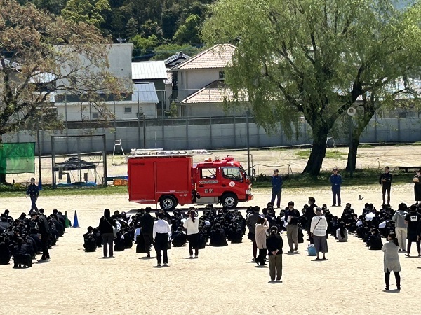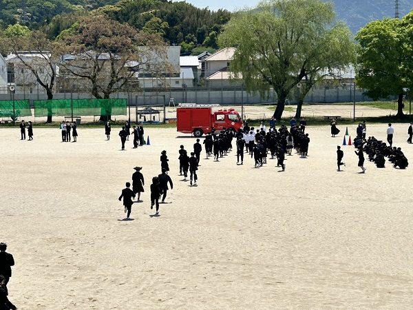 大分東部消防署坂ノ市出張所の署員4名の方に参加いただき、避難訓練を行いました。職員室から出火したという想定で、各教室からグラウンドに避難しました。避難時間は、グラウンドに一番近い教室の1年生で3分53秒、一番遠い3年生で4分35秒でした。生徒からは、もっと早くなるという感想が多かったです。消防署の方からは、「訓練ということで、落ち着いて行動できていてよかった。火事は予想できないので、場所や時間、誰といるかわからないが、煙を吸わないようにして落ち着いて行動しましょう。」という話がありました。災害のニュースを連日目にしますが、身近に起こったときに、どのように行動すればよいか、改めて考えることができました。