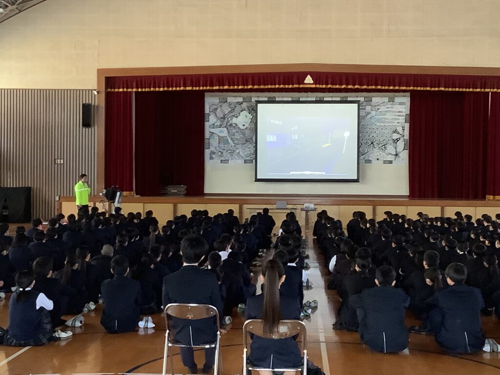 本日の午後、大分中央警察署の交通課の方と大分県交通安全協会の方をお招きし、3年生を対象とした交通安全教室を実施しました。4月からの進学にともない、自転車を使用する人もこれまで以上に増えることと思いますが、同じく4月からは道路交通法の改正により自転車の交通違反に対する「青切符(交通反則通告制度)」が導入され、罰則が強化されます。講師の方からは、映像やシミュレーターを用いながら、自転車に乗る時の交通法規や安全な乗り方についてお話がありました。誰もが自分に大きく関わることであり、生徒は集中して聞くことができていました。