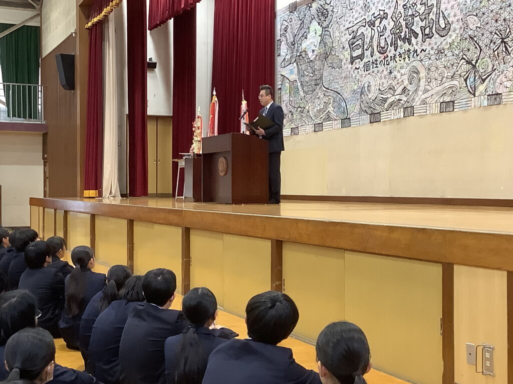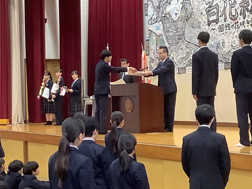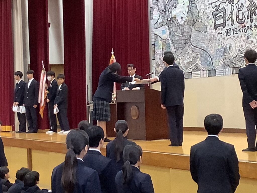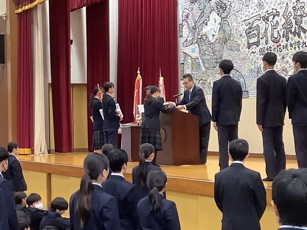 長かった2学期も本日終業式を迎えました。1年生の宿泊体験学習に始まり、合唱コンクール、響心祭 文化の部、2年生の修学旅行と数々の行事を経て、生徒は一段と成長したように感じます。本日の終業式での各学年代表による意見発表では、自分の頑張ったこと、一緒に頑張った仲間への感謝、冬休みの抱負等を堂々と述べていました。また、部活動だけでなく、美術、作文等たくさんの表彰も行われました。