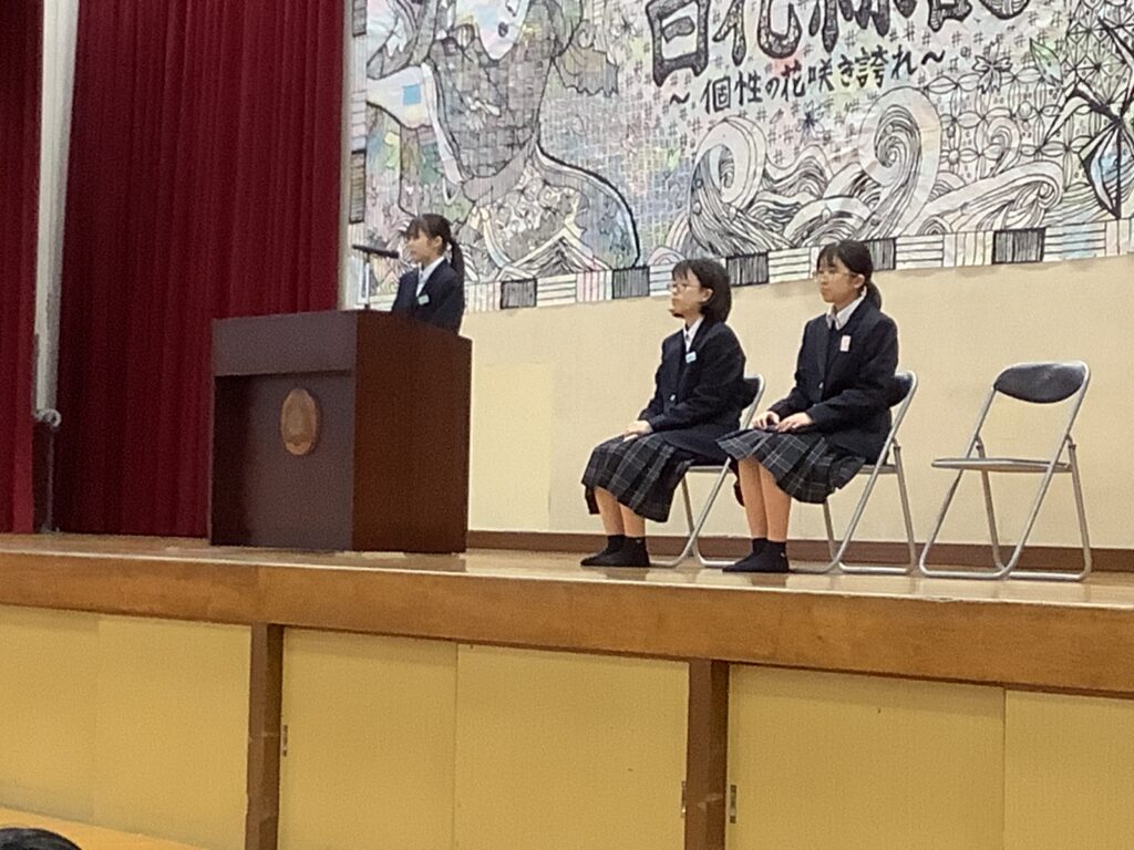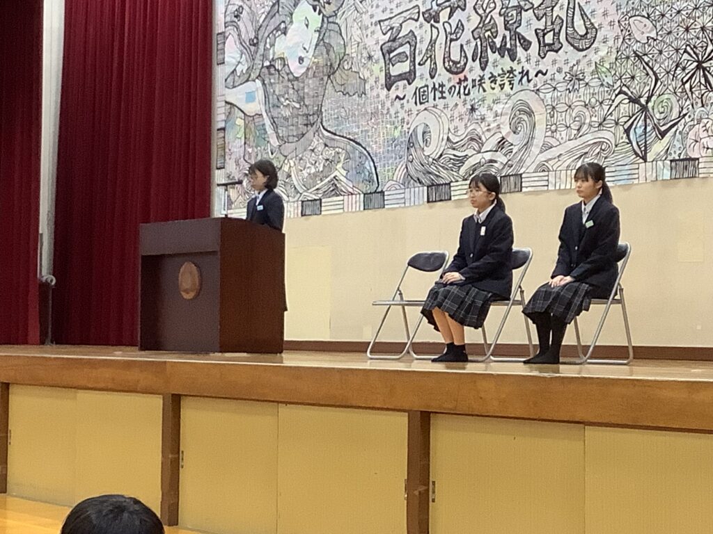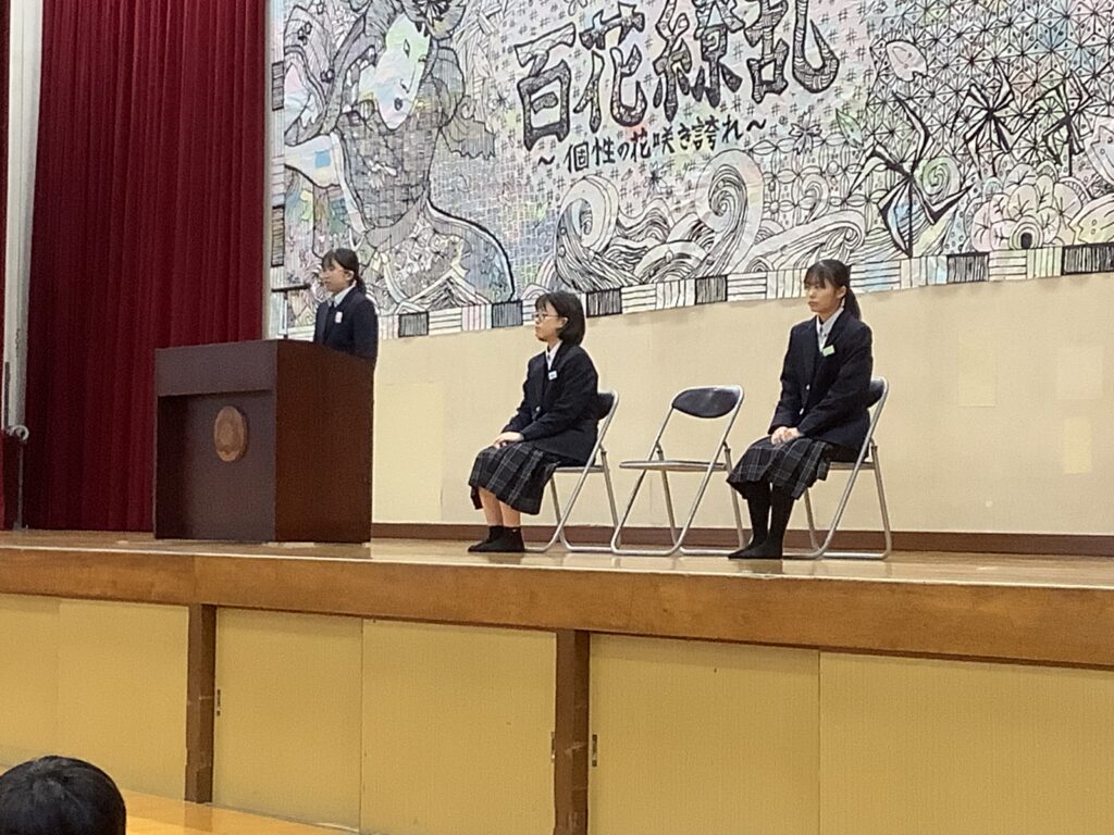 今日から3学期が始まりました。いよいよ、1年間の締めくくりの学期となります。本日の生徒の意見発表では、2学期の活動で学んだこと、上級学年への進級に向けて、しっかりとした心構えをもち取り組んでいくこと、進路実現に向けた努力を行うこと、これまで以上に周りの人への感謝の気持ちをもち、3年生全員で「有終の美」を飾れるように過ごすこと、などの抱負が述べられました。