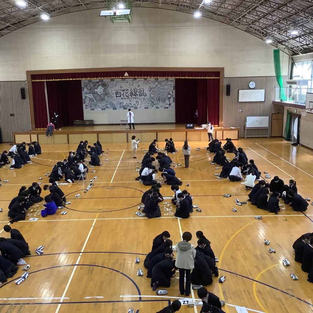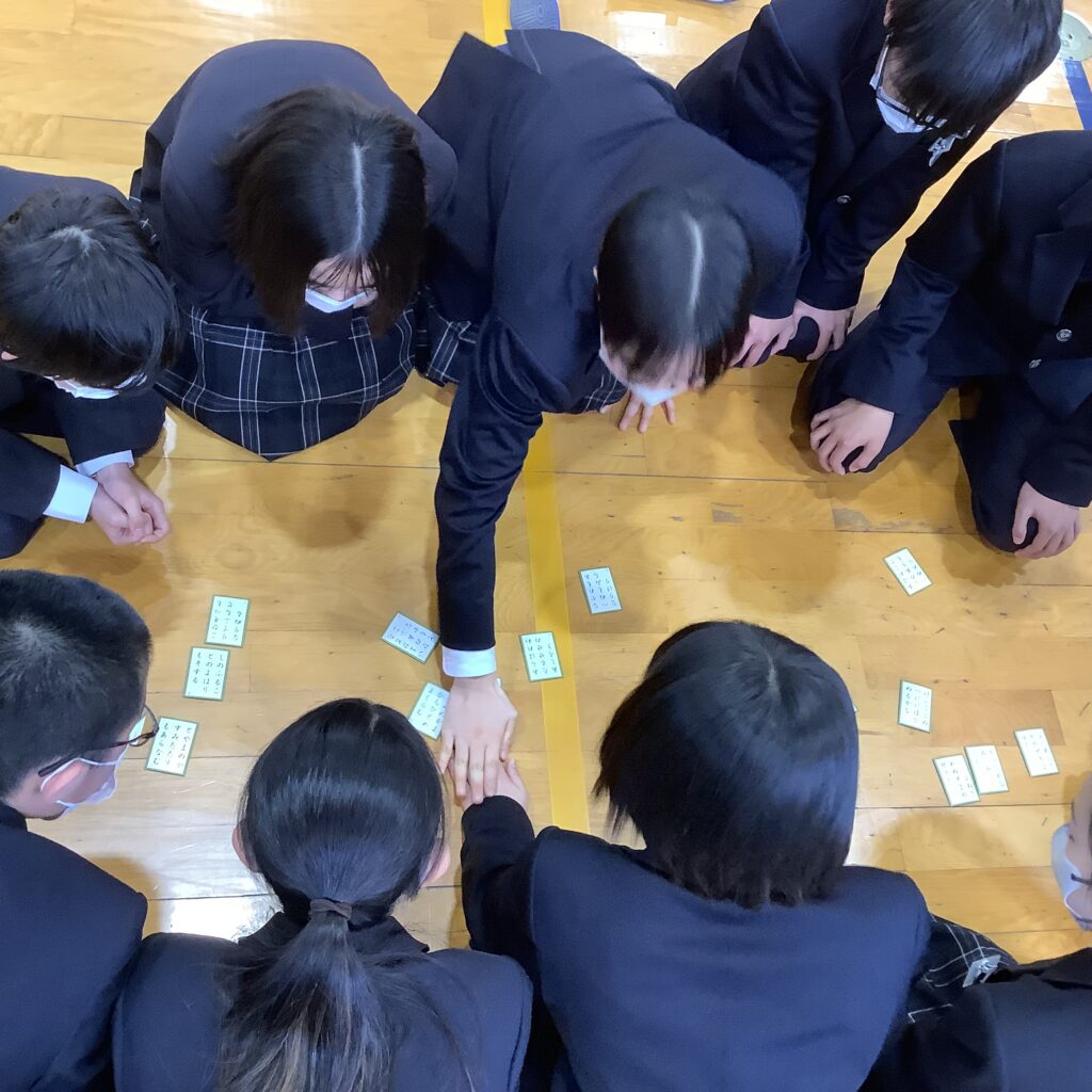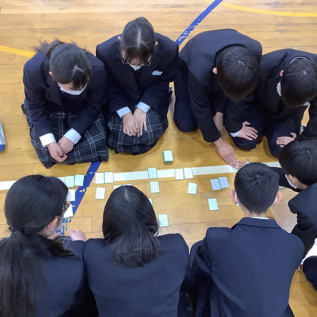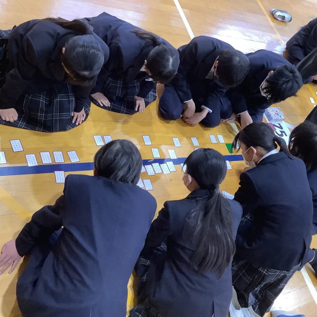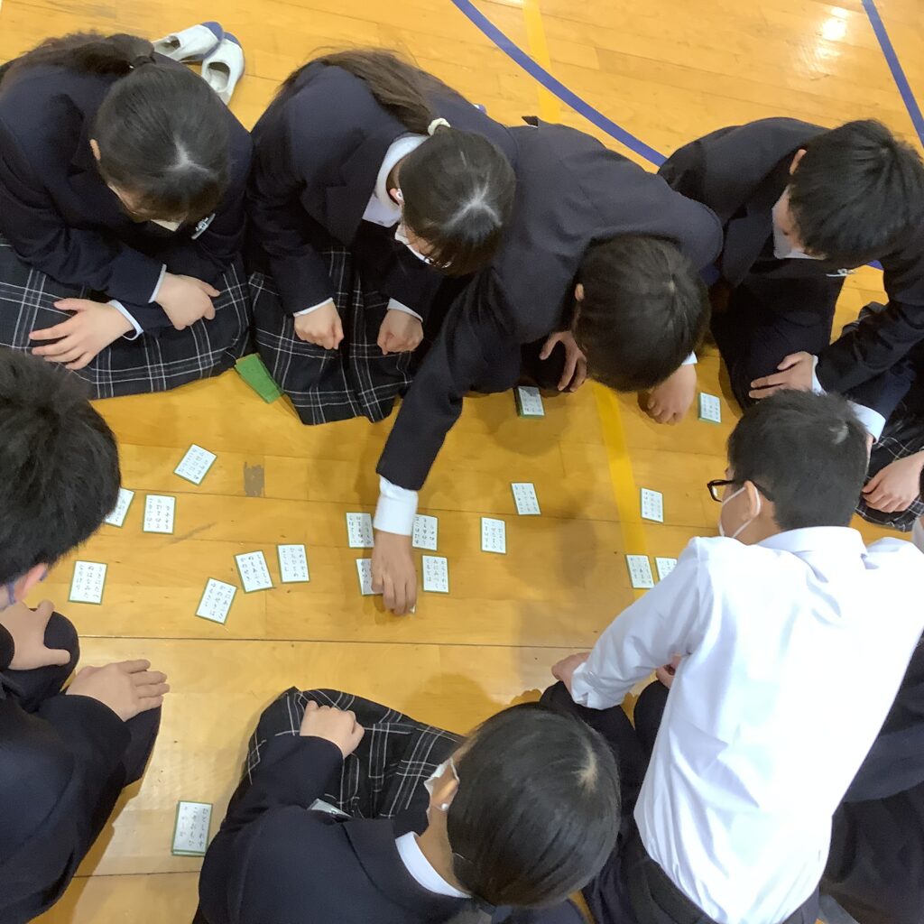 本日の午後は1年生の百人一首大会が行われました。生徒は何日も前から上の句、下の句を一生懸命に覚えて、今日の本番に臨みました。学年の先生方が交代で読み手となり、次々と歌を読み上げていましたが、中には、上の句を読み上げた瞬間に、すぐに札をとる生徒もいたり、自分から遠いところにある札を素早いスピードで取ったりするなど、白熱の戦いが繰り広げられました。生徒は、日本の伝統文化に親しむ時間を過ごすことができました。