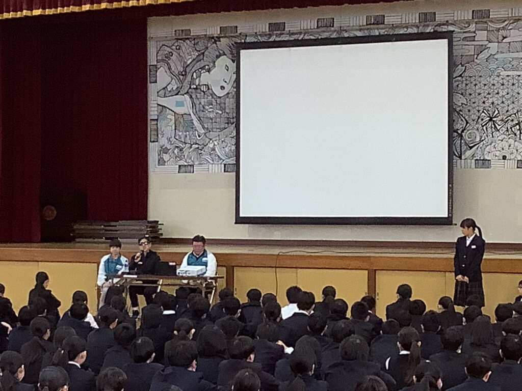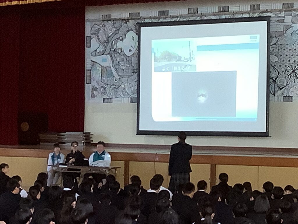 前半は生徒からの質問コーナー、後半は視覚障がいの方は景色などがどのように見えているのか、米岡さんが実際に使われている音声表示機能を用いると、文章はどのように聞こえるか、などについて見たり、聞いたりすることができ、生徒は積極的に参加していました。米岡さんの次の目標はロサンゼルスパラリンピックのブラインドマラソンに出場することだそうです。視力を失ってできるようになったことがある、どうしたらできるようになるかを考えている、と前向きに努力を続ける米岡さんの姿にたくさんの学びがあった時間となりました。