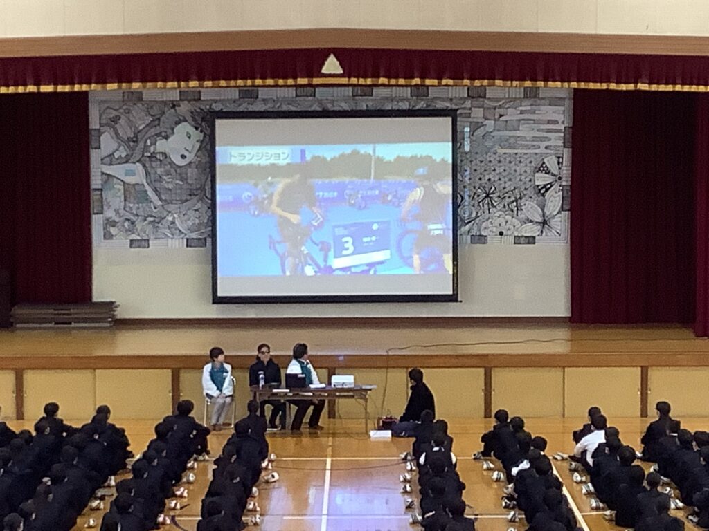 本日は第74回別府大分毎日マラソンに参加された米岡 聡(よねおか さとる)さんを講師にお招きし、講演をしていただきました。米岡さんは10歳の時に網膜はく離を発症し、現在は左目で太陽の光を感じる程度という状態で過ごしているそうですが、トライアスロン競技で、東京パラリンピック、パリパラリンピックに2大会連続で出場され、東京パラリンピックでは見事銅メダルを獲得されました。
