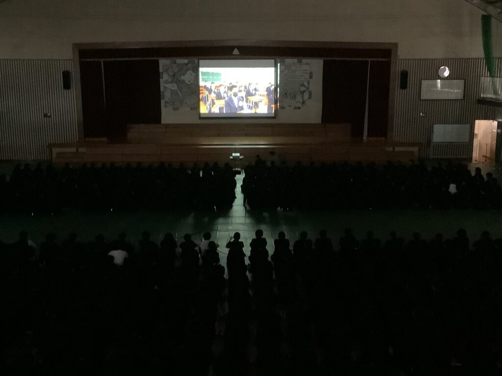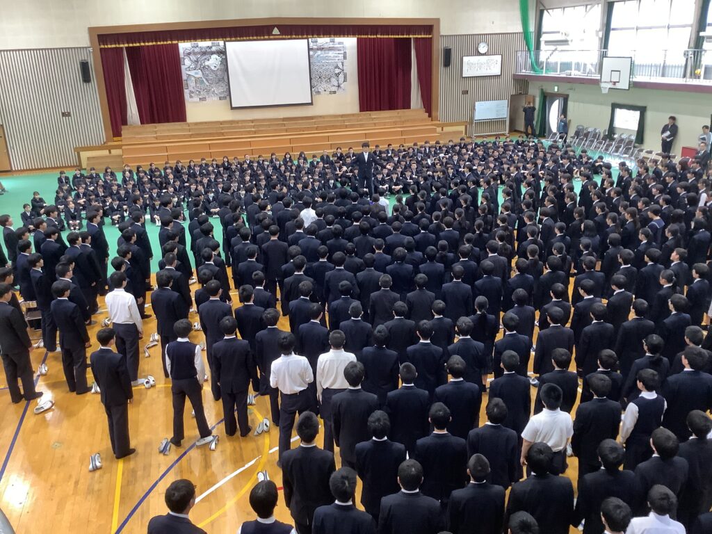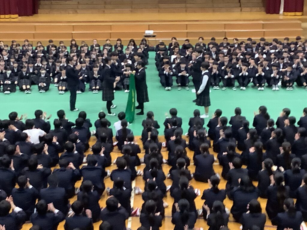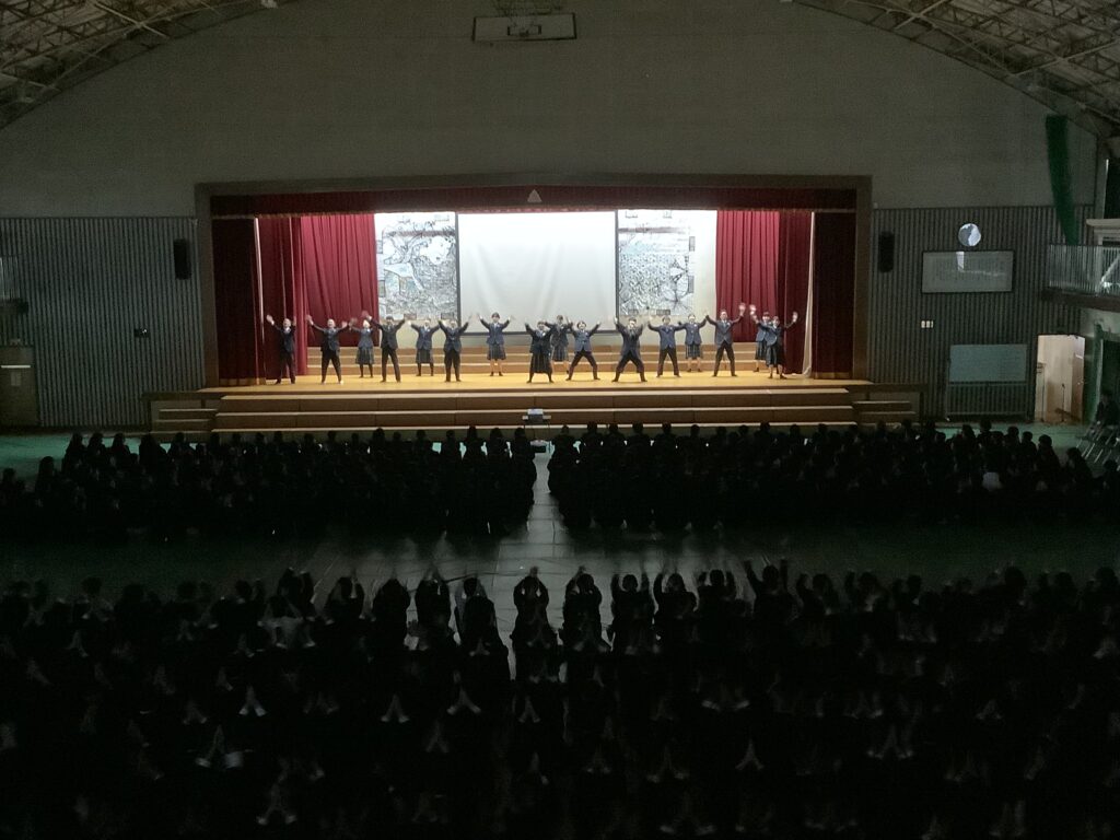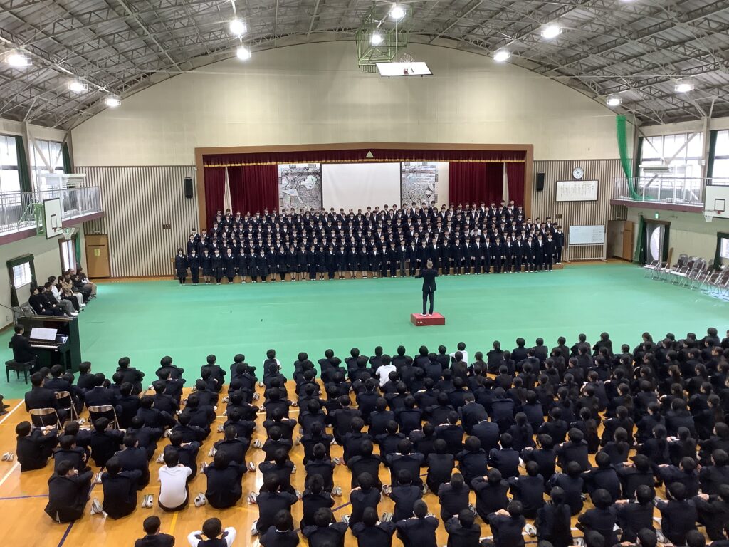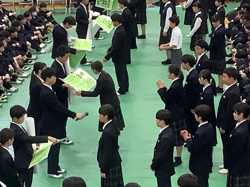 卒業式を3日後に控え、本日の午後に3年生を送る会が実施されました。滝尾中学校は在校生の人数が多いため、卒業式当日に全員が体育館に参加することができません。よって、全校そろって実施する行事はこれで最後となります。