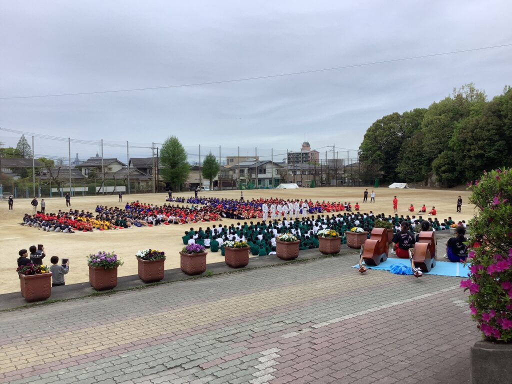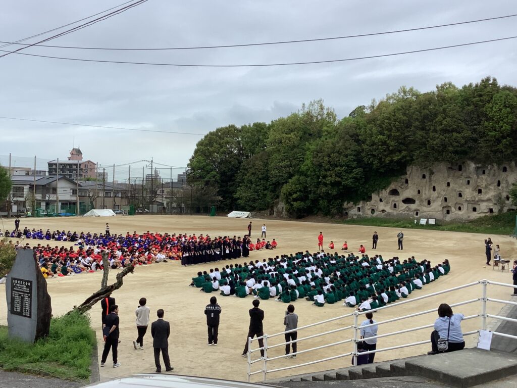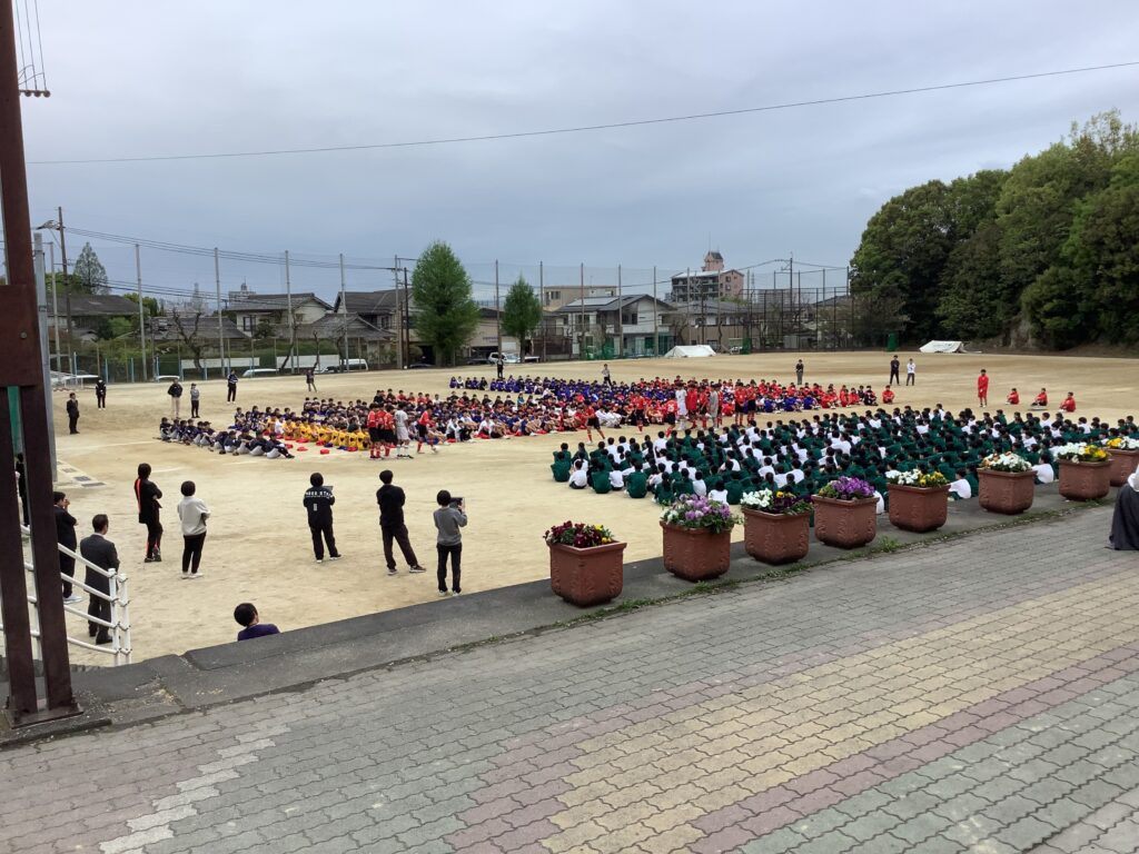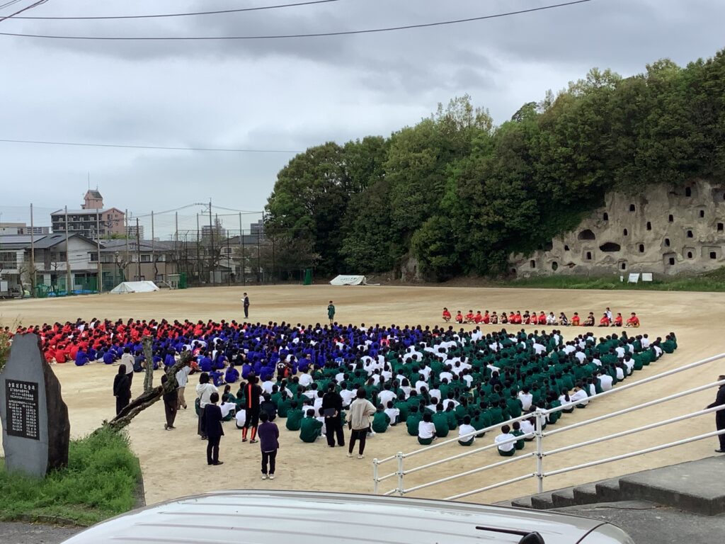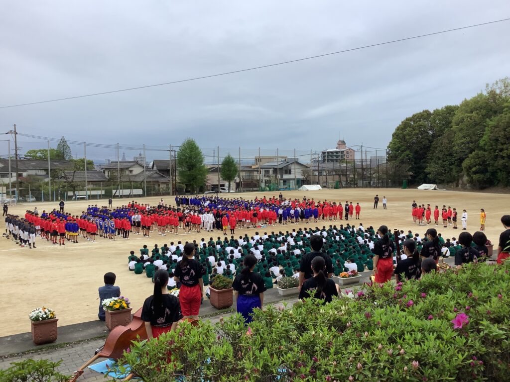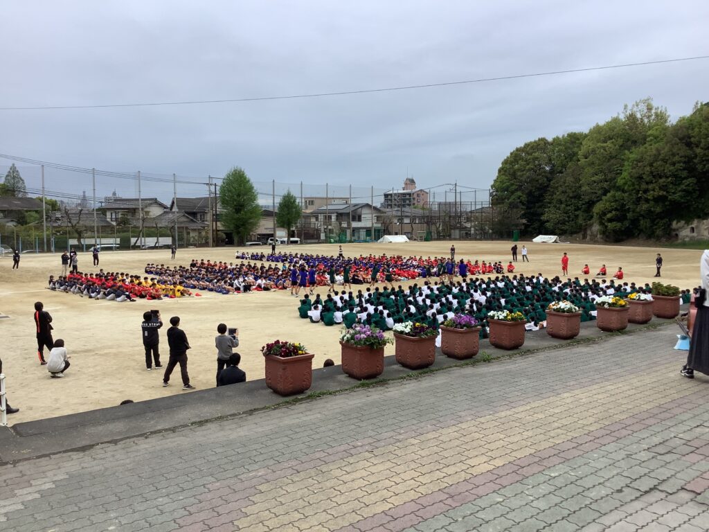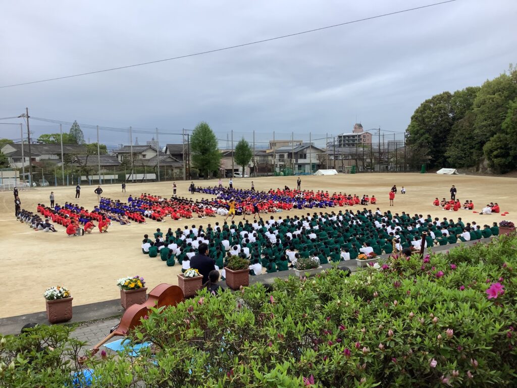 午後から雨の予報であったため、5、6限に実施予定だった2,3年生と1年生との対面式と親睦会を1,2限に変更し、グラウンドで行いました。昨年度は雨のため、体育館でzoomを用いての実施となりましたが、今年度は全員がグラウンドに集まり、実施することができました。生徒会執行部による学校生活の紹介、校歌の紹介、各部の特色を生かした部活動紹介、全校生徒によるクイズが行われ、笑顔あふれる時間となりました。1年生は、今日見たいろいろな紹介を参考にしながら、充実した中学校生活を送ってほしいと思います。