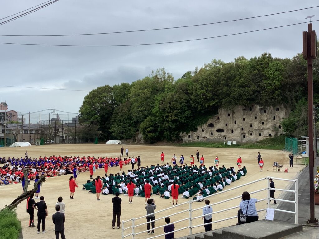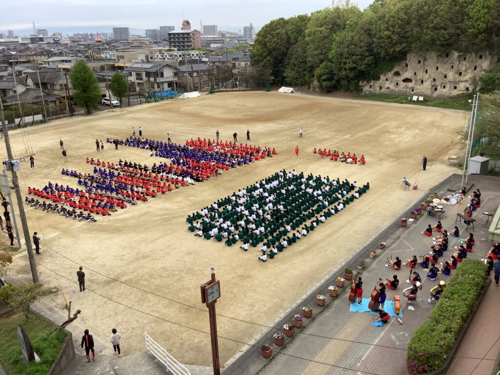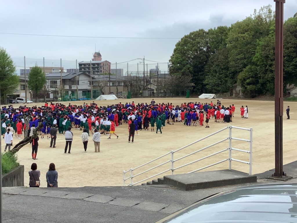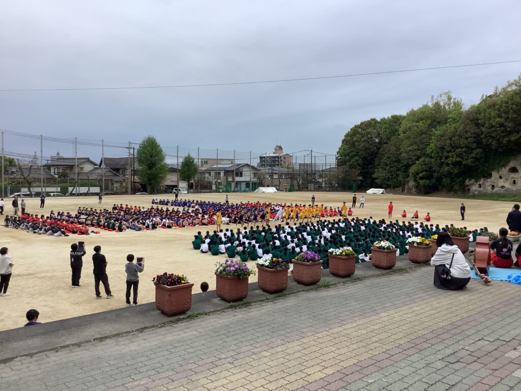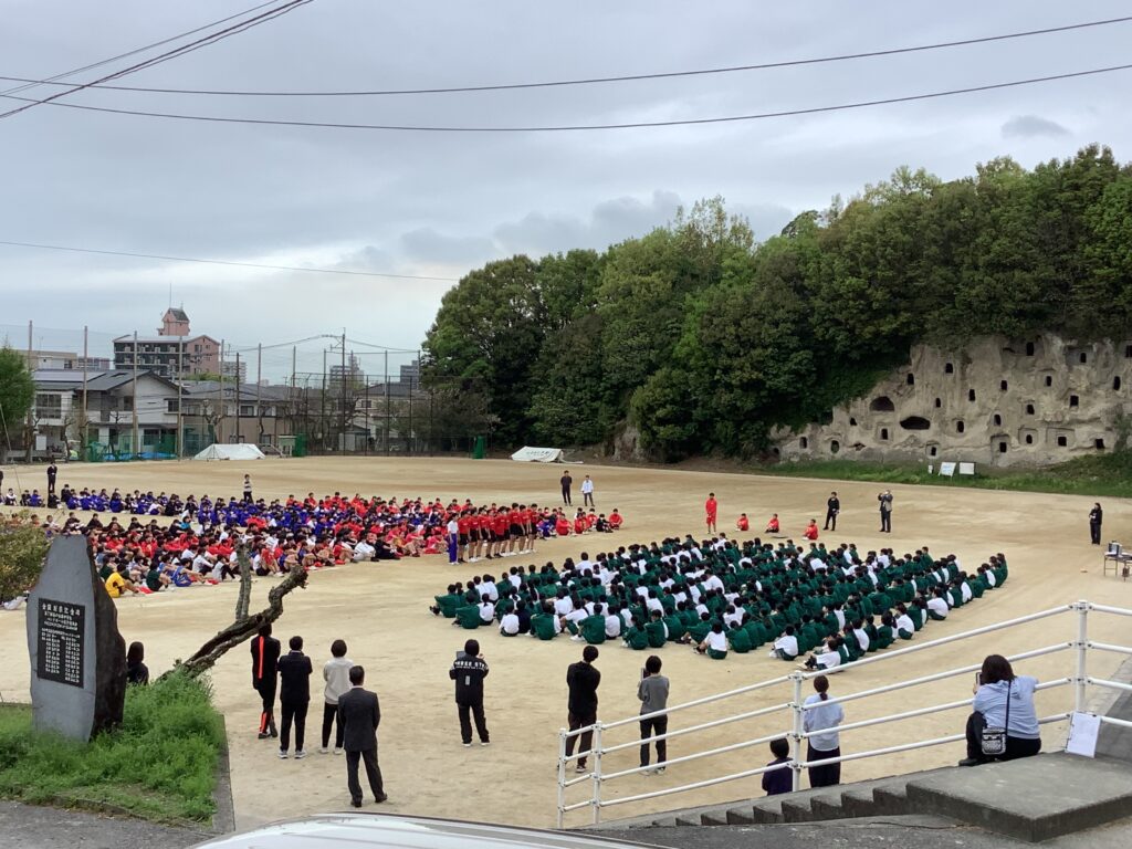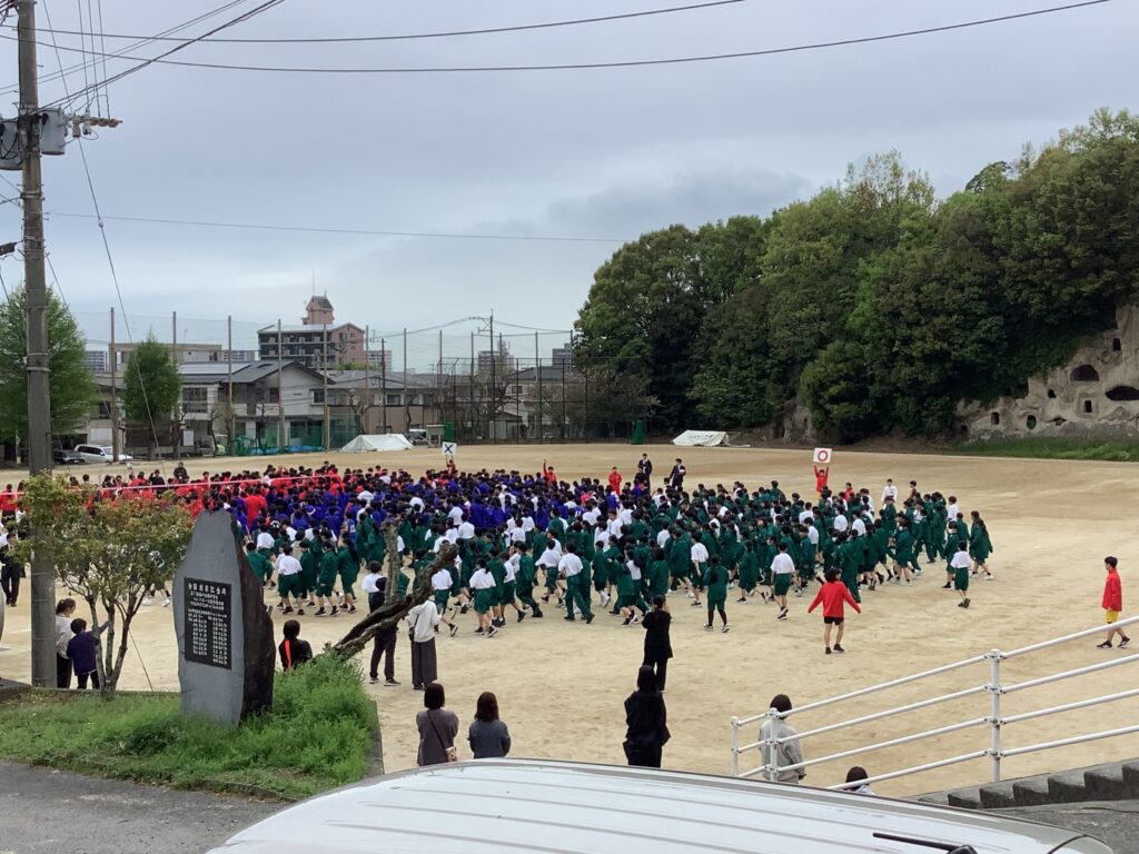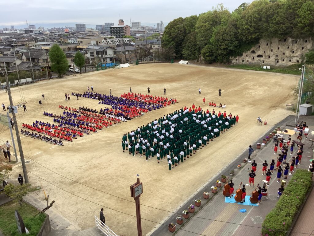 午後から雨の予報であったため、5、6限に実施予定だった2,3年生と1年生との対面式と親睦会を1,2限に変更し、グラウンドで行いました。昨年度は雨のため、体育館でzoomを用いての実施となりましたが、今年度は全員がグラウンドに集まり、実施することができました。生徒会執行部による学校生活の紹介、校歌の紹介、各部の特色を生かした部活動紹介、全校生徒によるクイズが行われ、笑顔あふれる時間となりました。1年生は、今日見たいろいろな紹介を参考にしながら、充実した中学校生活を送ってほしいと思います。