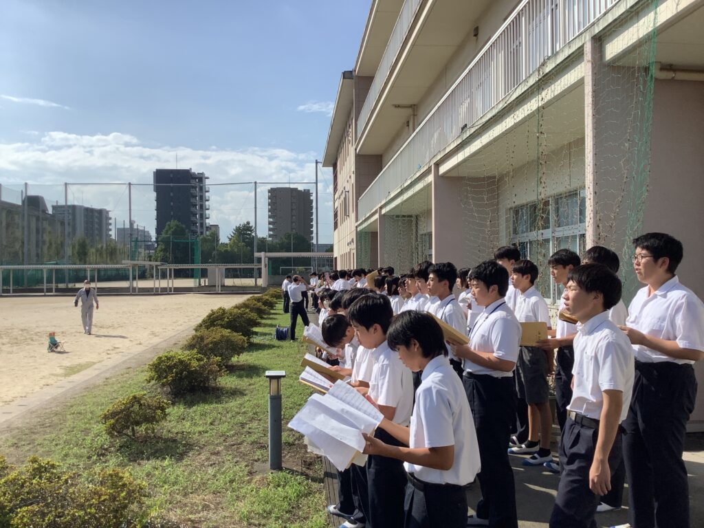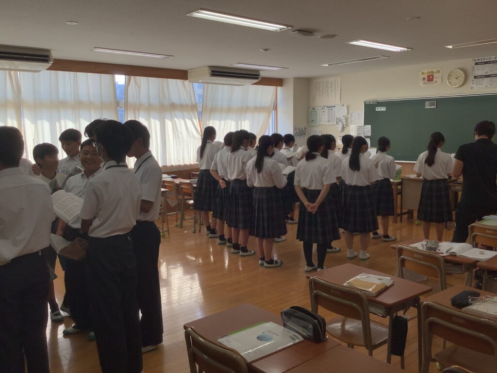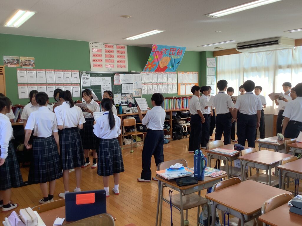 10月21日(火)に予定されているR7年度上野ヶ丘中学校合唱コンクールに向けて、各クラスの合唱練習が10月6日月曜日から始まりました。各クラスは、6月末に合唱コンに取り組む自分たちの曲を選び、音楽の授業で練習してきました。放課後にどのフロア、どのクラスからも歌声が響いてきて、校舎に活気が満ちわたるように感じます。形として残るものではない「歌」というものを創り上げるために、クラスの仲間と歌をそろえる練習・心をそろえる練習を一生懸命頑張る生徒の姿は、上野ヶ丘中学校の素晴らしい伝統です。