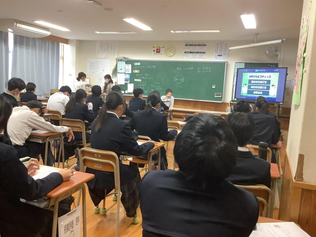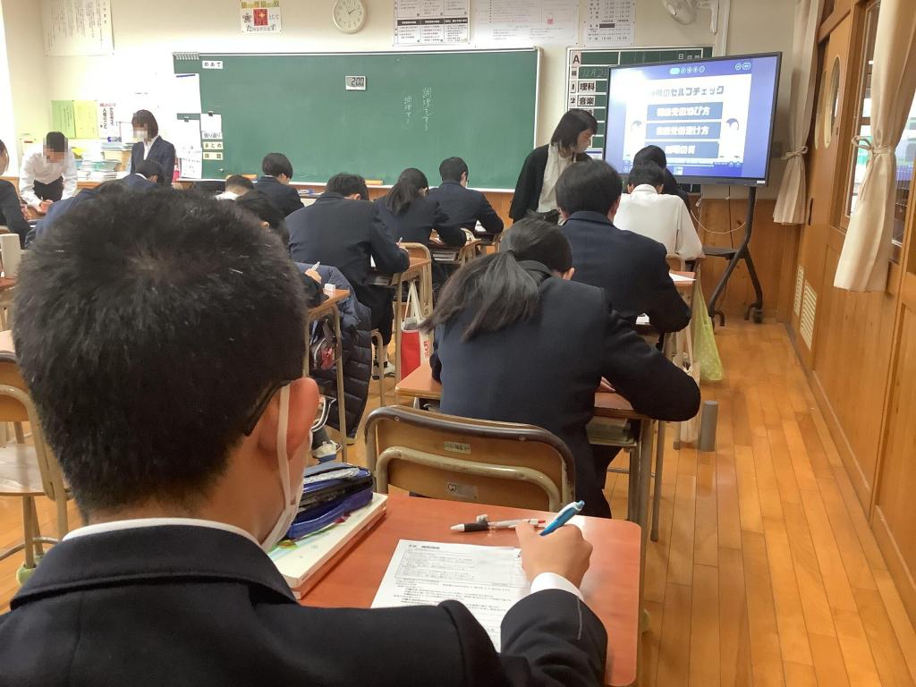 今回も3年の保体厚生委員が作成した動画を各クラスの保体厚生委員が説明しながら、「睡眠と光の関係」、「朝の光の浴び方」、「夜の光の避け方」などについて学びました。そして、睡眠習慣のセルフチェックを行い、睡眠改善のための具体的目標を決めました。
