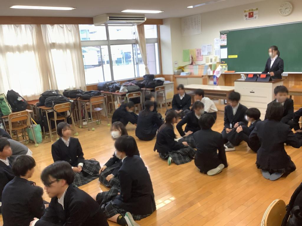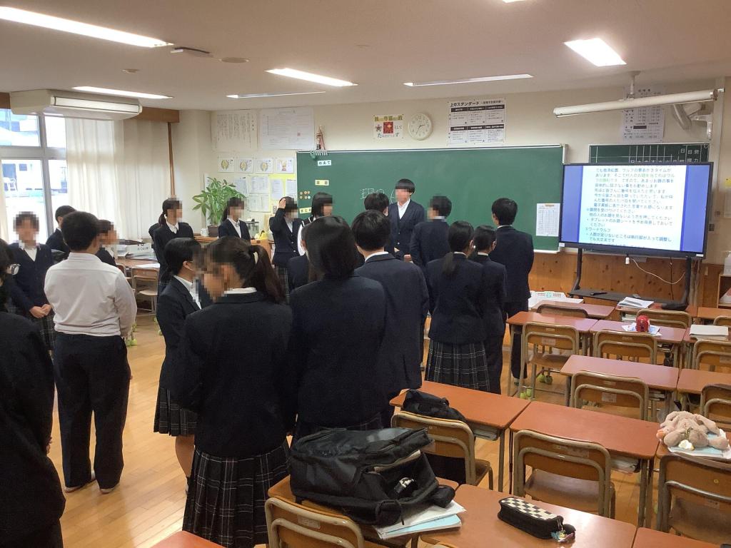 本日は、3年生徒会執行部が、「全校の和・輪を深め、上中をより良くしたい」、と目標を掲げ企画した「フレンディング プロジェクト」の2回目を実施しました。定例の人間関係づくりプログラムは各学級で行われますが、今回のこの企画は学年が交じり合ったグループで行われます。今回はじゃんけん列車と「ワードウルフ」という活動を行いました。3年生の思いは、もうすでに全校に伝わっっていると感じます。今まで3年生が中心となって全校で作りあげてきた上中の温かい雰囲気はずっと大切にしていきたいと思います