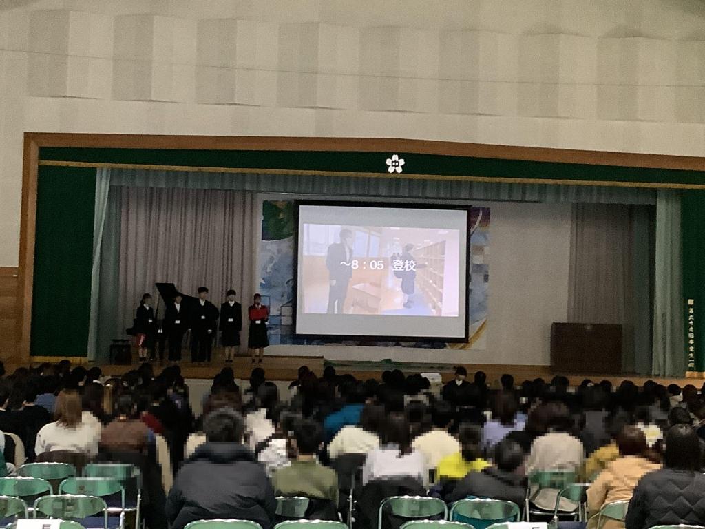 次に、本校1年生の生徒会執行部が代表して学校紹介を行いました。校訓や学校の様子を、編集した動画で説明しました。校歌は、代表数名で実際に歌って紹介してくれました。昨年は、入学説明会に参加していた側だった1年生が、とても凛々しい姿で中学校の説明を発表している姿に1年間の大きな成長を感じ、とても感心しました。今年も、1年間で成長した上中の素晴らしい先輩たちの姿が6年生たちの目・心にしっかりと映ったことでしょう。