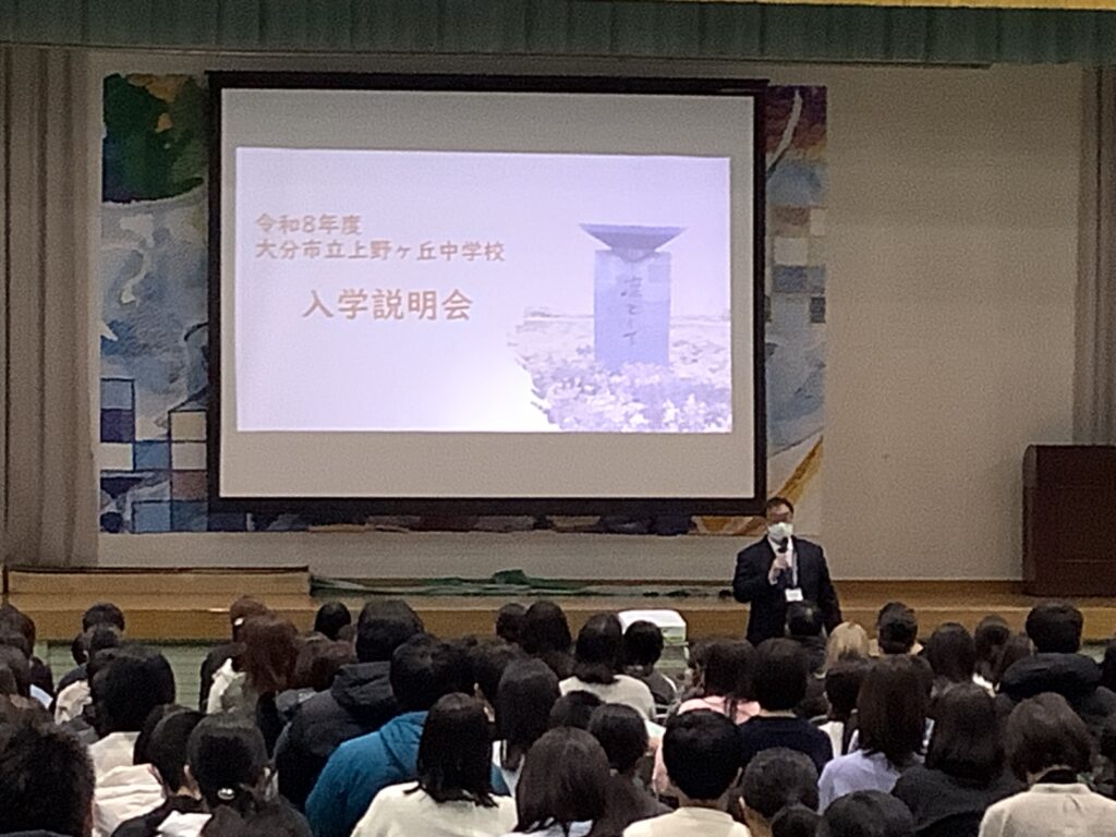 本校体育館にて、令和8年度新入生入学説明会を実施しました。「入学説明会」は、小中一貫教育の取組の一つとして毎年行っています。新入生にとって疑問や不安が少しでも解消されるように、今後も上野ヶ丘中校区の小中のつながりを大切にしていきたいと思います。