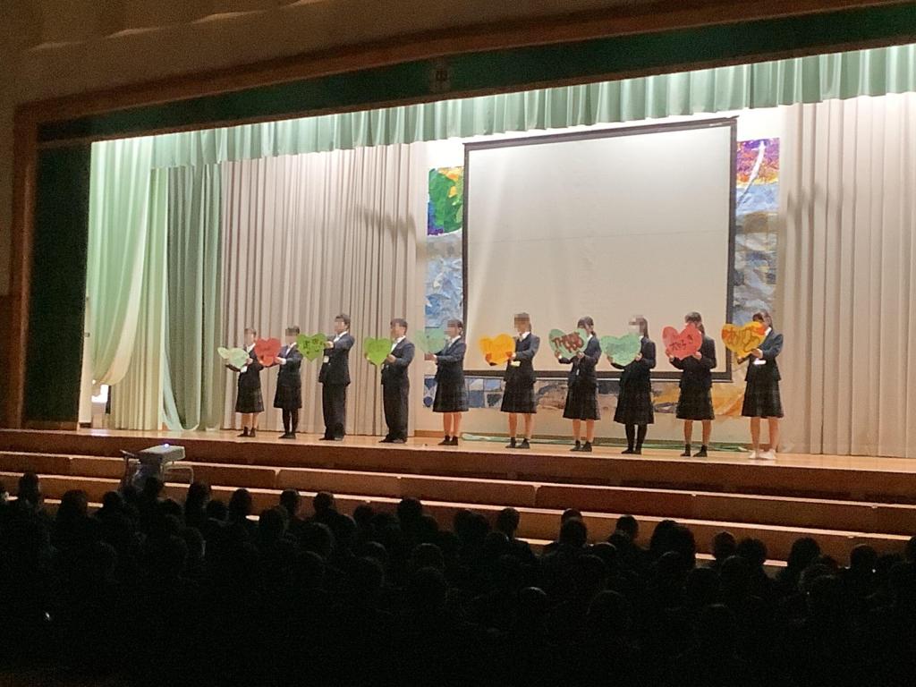 上中では「3年生に贈る会」を、「あったかハートの会」と名付けて開催しています。「お世話になった3年生に1・2年生から「感謝」の気持ちを伝え、この会を良い思い出にしてもらい、卒業に向けての気持ちを高めてほしい。」という思いから、1・2年が企画・運営をしました。2年生にとっては、1年生を引っ張りながら運営する初めての全校行事の取組です。