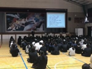 11月28日(金)、稙田東中学校体育館にて、全校生徒を対象に「がんについて正しく知り、自分や周りの人の健康と命の大切さについて考える」ことを目的として、がん教育講演会を行いました。講師は社会福祉協議会 大分市老人クラブ連合会事務局の有馬徹様でした。一人でも多く、講演会の目的や内容を理解し、日常生活等で実践してもらえたらなと思います。